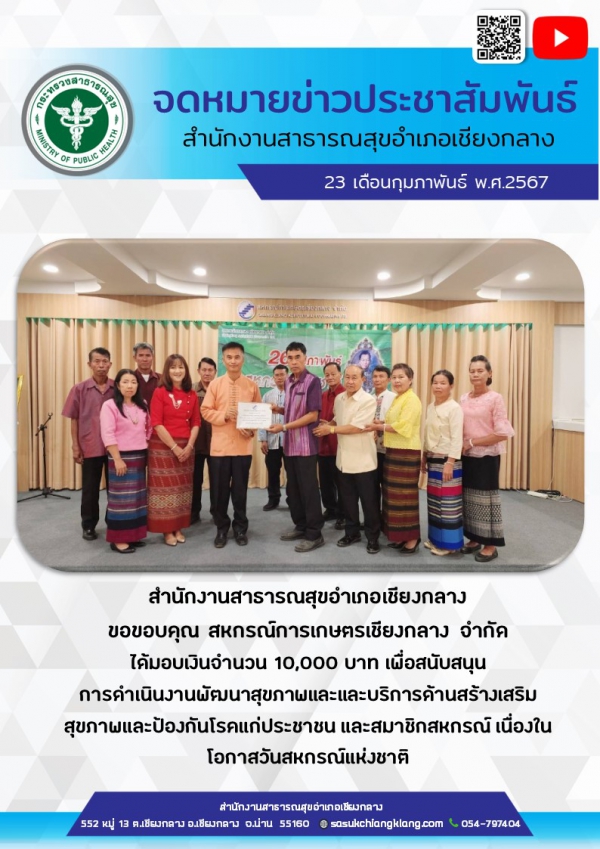 สำนักงานสาธารณสุขอำเภอเชียงกลาง ขอขอบคุณ สหกรณ์การเกษตรเชียงกลาง จำกัด