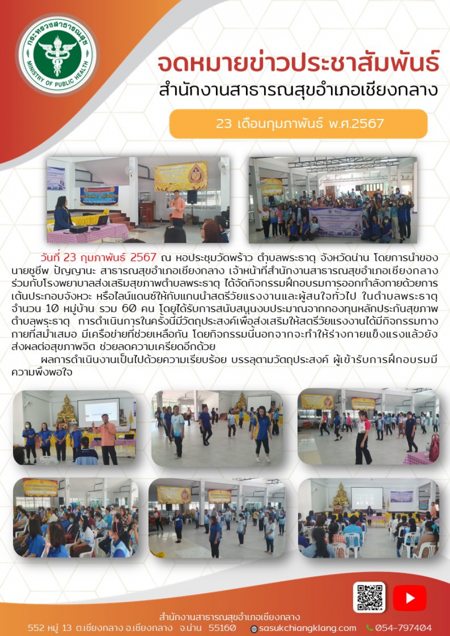 กิจกรรมฝึกอบรมการออกกำลังกายด้วยการเต้นประกอบจังหวะ ให้กับแกนนำสตรีวัยแรงงานและผู้สนใจทั่วไป ในตำบลพระธาตุ