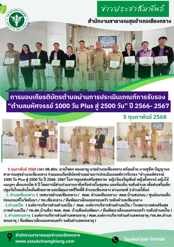 การมอบเกียรติบัตรตำบลผ่านการประเมินเกณฑ์การรับรอง “ตำบลมหัศจรรย์ 1000 วัน Plus สู่ 2500 วัน” ปี 2566- 2567